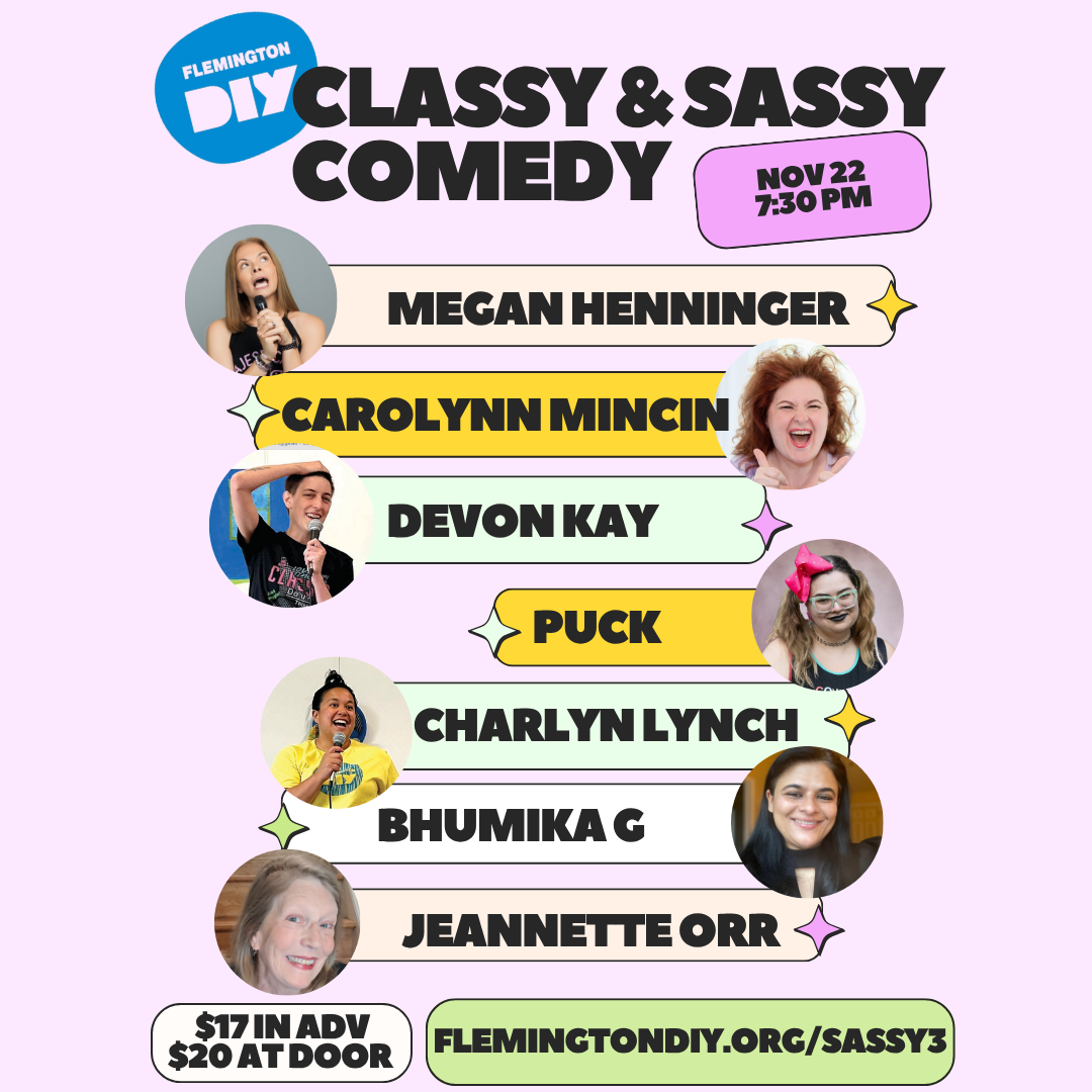 Join us for our fall Women’s Comedy Showcase Saturday, November 22, 2025, 7:30pm, featuring performers from our monthly comedy open mic. Comics include Megan Henninger, Carolynn Mincin, Devon Kay, Puck, Charlyn Lynch, … Read moreNov. 22: Classy & Sassy Women’s Comedy Showcase