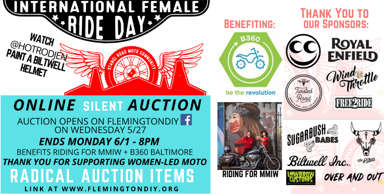Our silent auction benefits two women-led, moto organizations that are out there doing good in the world: B-360 Baltimore and Riding for MMIW.