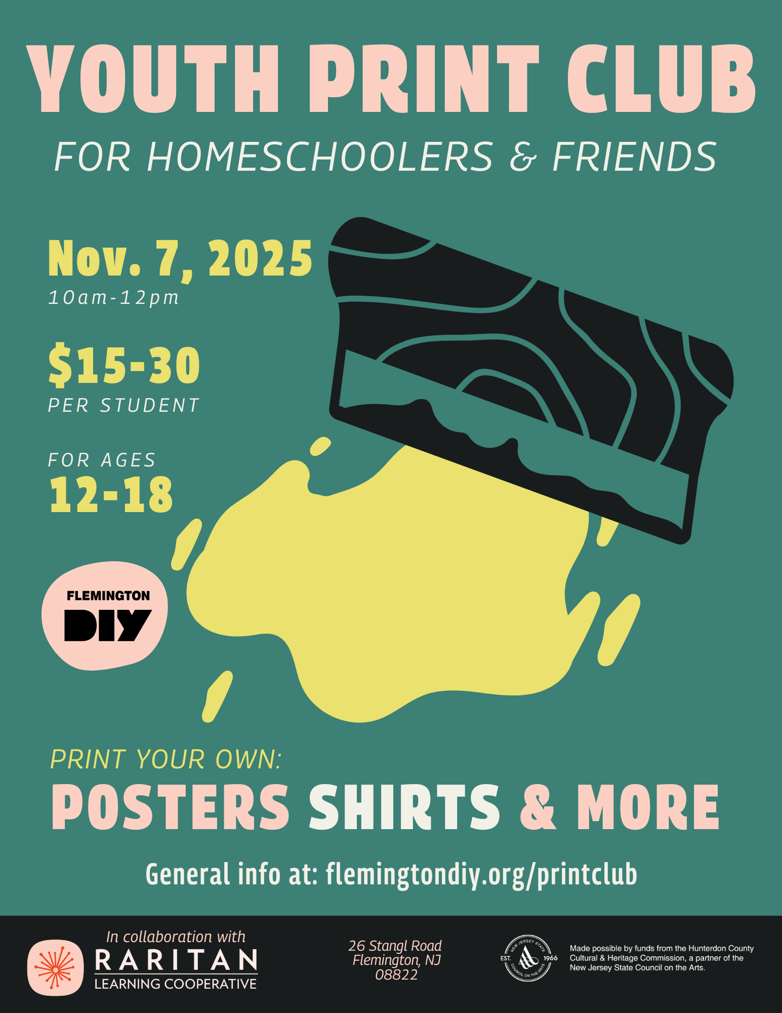 Flemington DIY and Raritan Learning Cooperative are collaborating to offer a print club for kids ages 12-18, for this one-off youth print club – perfect for homeschoolers and friends! Bring a design and a t-shirt or anything you want to print on.